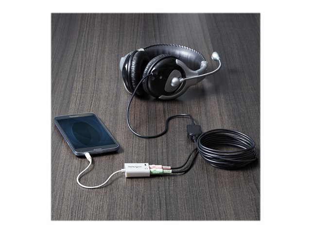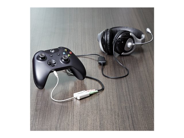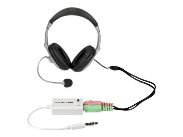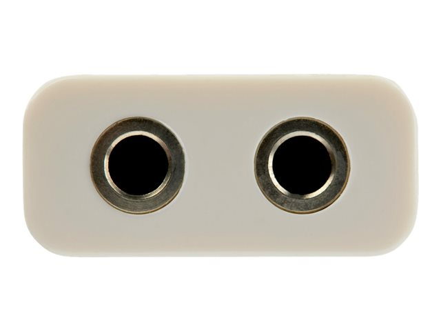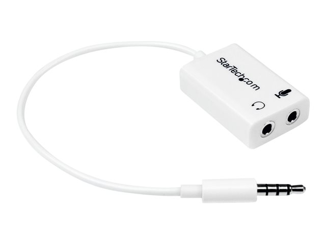 - Information Have you recently purchased a newer laptop or Ultrabook and now you can't figure out where to plug in your favorite headset? Most new laptops and Ultrabooks come equipped with a single 3.5mm 4-position (4pin) audio port that supports both audio input and output. A great number of headsets on the market come equipped with two separate headphone and microphone connectors that are not compatible with this new configuration. The MUYHSMFFADW white headset adapter features two 3.5mm 3-position ports that provide a separate headphone and microphone connection that can be connected to the single audio port on your laptop. Alternatively, you can also connect a separate microphone and powered speakers if you prefer to use Skype or chat online without using a headset. Simply connect the headphone plug from your headset into the audio output port marked with the headphone symbol, and connect the microphone plug into the audio input port marked with the microphone symbol. Plug the adapter into the audio port on your laptop and you're all set. Want to work or game without using a headset? You can also connect a microphone and powered speakers to your laptop using the adapter. Just plug in your microphone into the audio input port marked with the microphone symbol, and plug your powered speakers into the audio output port marked with the headphone symbol, and connect the adapter to the audio port on your laptop. Are you travelling for work or taking a trip? The headset adapter features a compact and sturdy design that makes it the perfect solution for mobile applications. Tuck the adapter in with your tablet or slip it inside another carrying case. It works great with tablets and smartphones that have a single audio port. Just connect the headphone and microphone plugs from your headset into the adapter, connect the adapter to your mobile device and start talking. This adapter is not a headphone splitter or Y-cable. It cannot be used to split the audio output to two separate sets of headphones or speakers. Some laptops and mobile devices will not work with all external microphones. This is typically caused by an impedance mismatch between the microphone and the device. This is due to hardware incompatibility and is not a limitation of the MUYHSMFFADW adapter.