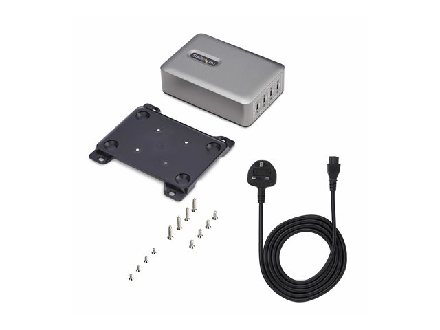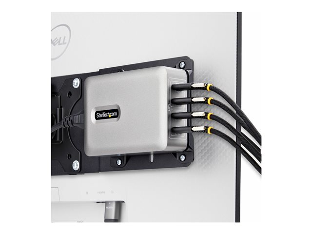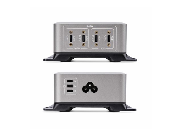 - Information The StarTech.com 4-Port USB-C Charger is a versatile power adapter designed to efficiently charge various devices such as tablets, cellular phones, and notebooks. With a robust power output of 240 watts and the ability to provide multiple voltage levels ranging from 5 V to 28 V, this charger ensures you are equipped for all your charging needs. The charger complies with standards including UL, FCC, RoHS, and DoE Level VI, ensuring a reliable and safe charging experience. Equipped with features such as overheat and overvoltage protection, along with a Kensington security slot, this charger combines safety with security. The inclusion of GaN technology enhances power efficiency while maintaining a compact design. The user-friendly design includes a screw lock system and rubber feet for stability. Whether at home or in the office, the StarTech.com 4-Port USB-C Charger stands as a convenient solution for powering up multiple devices simultaneously.
